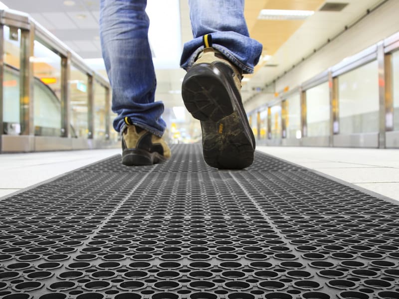 Die wasserbeständige Matte aus recyceltem Gummi eignet sich besonders für öffentlich begehbare Bereiche